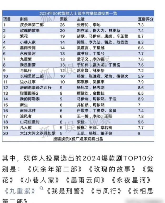 以上排名只是媒体人根据自己的喜爱进行投票,他们的选择只能代表部分观众,每个人心中都有2024年最喜欢的一部电视剧,所以看到排在前三名的剧后,很多网友并不满意,各位读者,你们认为2024年,哪部剧算是真正的爆剧呢?